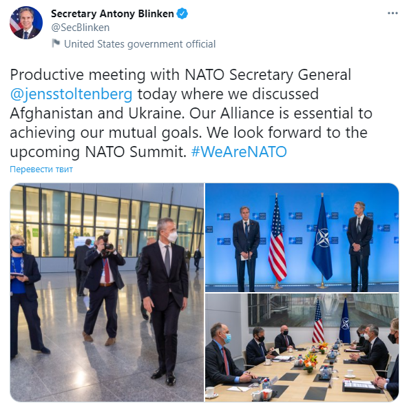 "Продуктивная встреча с генсеком НАТО. Сегодня мы обсуждали Афганистан и Украину. Наш Альянс необходим для достижения наших общих целей. Мы с нетерпением ждем предстоящего саммита НАТО", - написал в Блинкен в Тwitter.