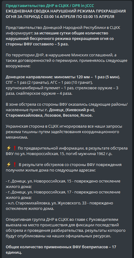 "Украинская сторона в СЦКК игнорировала все наши запросы режима тишины путем задействования координационного механизма. По предварительной информации, в результате обстрела ВФУ по ул. Новороссийская, 15, погиб мужчина 1962 г.р", - говорится в сообщении.