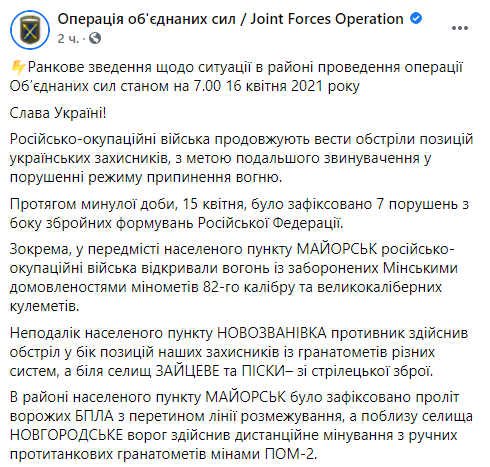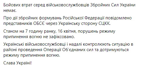 В то же время украинский штаб Операции объединенных сил заявил, что вторые подряд сутки прошли без потерь. Также ООС не зафиксировал 16 апреля обстрелов со стороны противника.