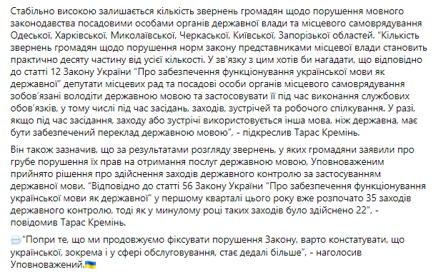 1 129 сообщений о нарушении языкового законодательства в различных сферах общественной жизни получил мовный омбудсмен Тарас Креминь за три месяца действия ст. 30 закона "Об обеспечении функционирования украинского языка как государственного". Об этом сообщается на странице уполномоченного по защите государственного языка в соцсети.