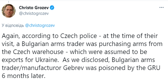 "По данным чешской полиции - во время их визита болгарский торговец оружием закупал на чешском складе оружие, которое, как предполагалось, предназначалось для экспорта в Украину. Как мы выяснили, болгарский торговец/производитель оружия Гебрев был отравлен ГРУ 6 месяцев спустя", - пишет Грозев.