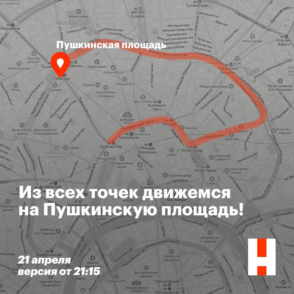 21:15 Сторонников Навального зовут на Пушкинскую площадь.