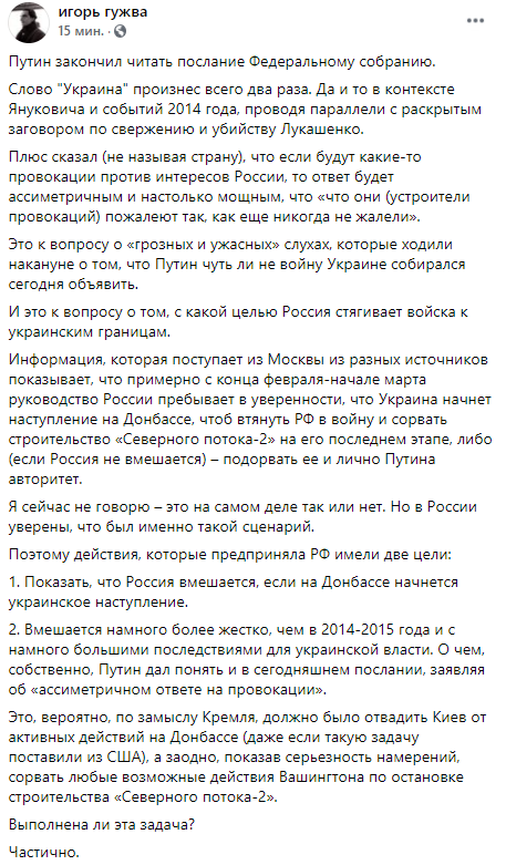 2. Вмешается намного более жестко, чем в 2014-2015 годах, и с намного большими последствиями для украинской власти. О чем, собственно, Путин дал понять и в сегодняшнем послании, заявляя об "ассиметричном ответе на провокации".