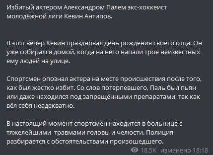 Кевин Антипов праздновал день рождения своего отца. Он уже собирался домой, когда на него напали трое неизвестных ему людей на улице и избили. В одном из них хоккеист узнал актера.