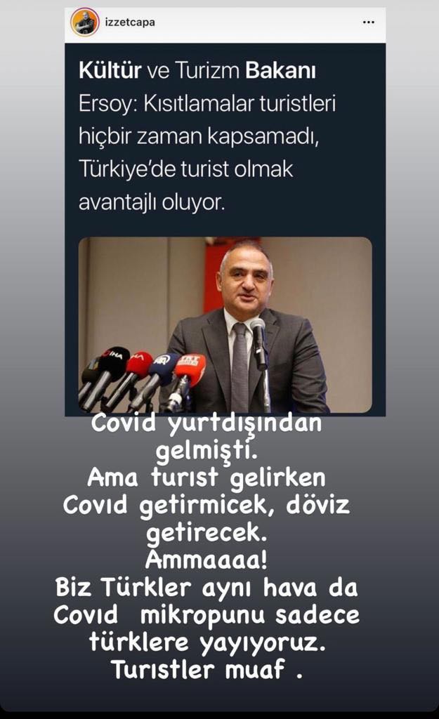 "Ковид завезли из-за границы. Но когда приедут туристы, они не привезут ковид, они привезут валюту. А микробы в воздухе действуют только на турок, к туристам не цепляются", - пишет в Инстаграм-сторис пользователь из Стамбула, ресторатор Мухаммед.
