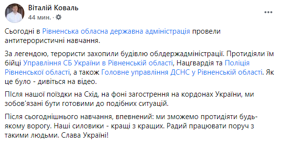 "После нашей поездки на Восток, на фоне обострения на границах Украины, мы обязаны быть готовыми к подобным ситуациям. После сегодняшнего обучения, уверен: мы сможем противодействовать любому врагу. Наши силовики - лучшие из лучших", - заявил Виталий Коваль.