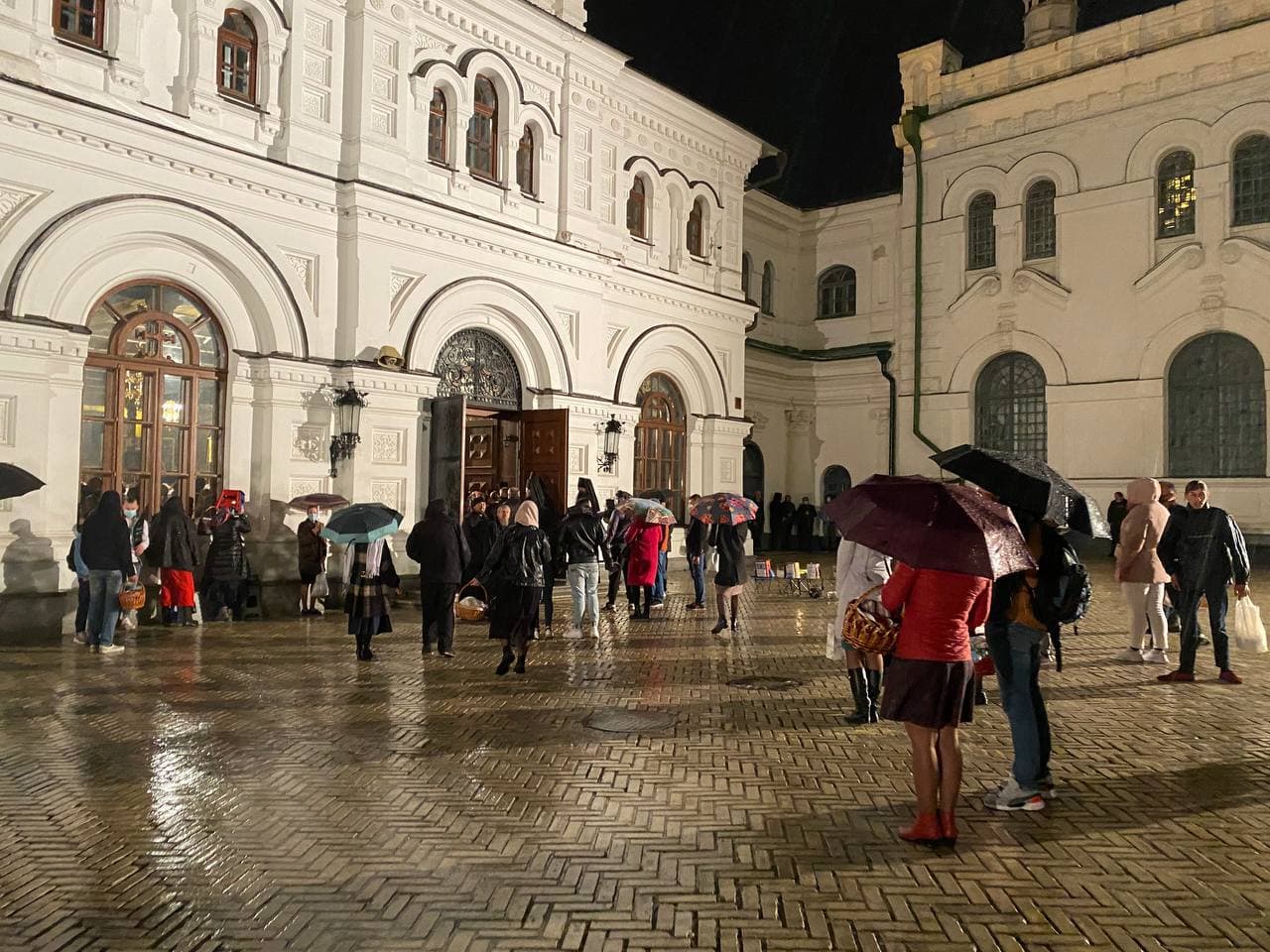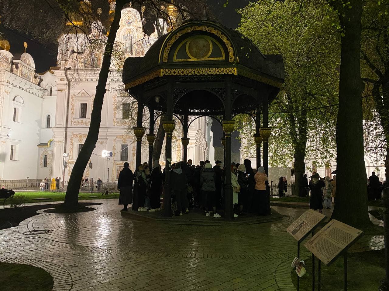 23:26  Начался дождь. Прихожане стоят в беседке на территории Лавры. Другие уже в храме.