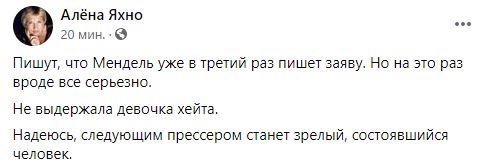 Не выдержала девочка хейта. Надеюсь, следующим прессером станет зрелый, состоявшийся человек", – написала блогер Алена Яхно.