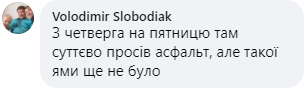 "С четверга на пятницу там существенно просел асфальт, но такой ямы еще не было", - комментирует эти фото житель Радехова Владимир Слободяк.