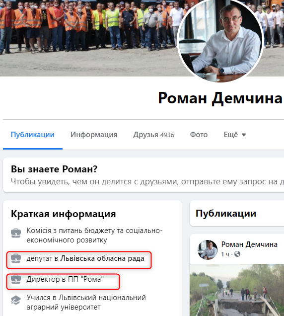 Фирмой "Рома", кстати, руководит львовский областной депутат Роман Демчина из "Европейской солидарности", что прямо указано у него на страничке в Facebook.