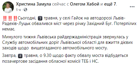 "На прошлой неделе Львовская райгосадминистрация обратилась в Службу автомобильных дорог Львовской области для принятия действенных мер по вышеупомянутому автомобильному мосту", - написала в Facebook глава Каменка-Бугского района Христина Замула (в этот район и входит упавший мост).