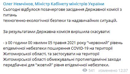 По его словам, сегодня состоялось внеочередное заседание Государственной комиссии по вопросам техногенно-экологической безопасности и чрезвычайных ситуаций. По его результатам комиссия решила отменить с 00:00 5 мая 2021 красный уровень эпидемической опасности распространения Covid-19 на территории Житомирской области. Вместо него применят мероприятия предусмотренные для желтого уровня эпидемической опасности.