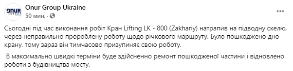 "Сегодня во время выполнения работ Кран Lifting LK - 800 (Zakhariy) наткнулся на подводную скалу, из-за неправильно проделанной работы по речному маршруту. Было повреждено дно крана, поэтому сейчас он временно приостанавливает свою работу", - говорится в посте.