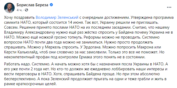"Хочу поздравить Владимира Зеленского с очередным достижением. Утверждена программа саммита НАТО, который состоится 14 июня. Так вот, Украину решили не приглашать. Совсем. Решение принято послами НАТО на их последнем заседании", – написал Береза.