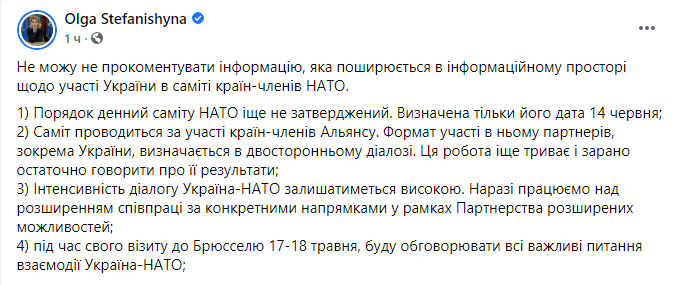 "Повестка дня саммита НАТО еще не утвержден. Определена только его дата 14 июня. Саммит проводится при участии стран-членов Альянса. Формат участия в нем партнеров, в частности Украины, определяется в двустороннем диалоге. Эта работа еще продолжается и рано окончательно говорить о результатах", - написала Стефанишина на своей странице в Facebook в пятницу, комментируя информацию об участии Украины в саммите стран-членов НАТО.