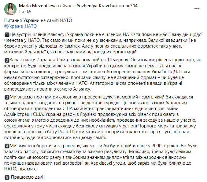 "Украина вместе с Грузией продолжает на всех уровнях работать с союзниками с целью доведения до них необходимость проведения мероприятия с нашим участием, учитывая в том числе сложную ситуацию с безопасностью в регионе Черного моря и продолжающуюся внешнюю агрессию со стороны России. Что мы можем говорить точно уже сейчас - все, что нам нужно, будет обсуждаться на этом саммите", - написала Мезенцева.