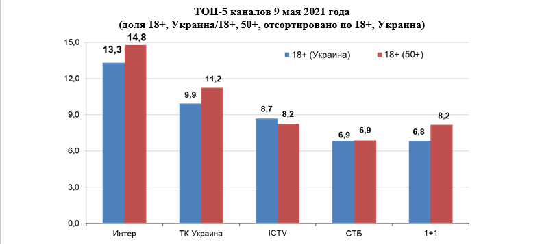 Данные исследования ТВ аудитории принадлежат ИТК. Оператор панели — Nielsen; мониторинг — Коммуникационный Альянс. Данные предоставлены телеканалом "Интер". Данные рассчитаны для целевых аудиторий 4+ (Украина), 18+ (Украина) и 18+ (50тыс.+). Данные рассчитаны для суток и слота события за 08-09.05.2021 (данные Live, Overnight). Данные предоставлены по показателям rat%, shr% и cov# (для аудитории 4+, Украина).