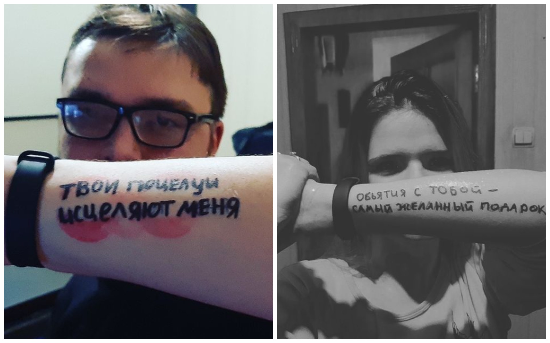 Они везде были вместе и делали совместные тематические фото, как эти снимки, где маркером на руках написали "Твои поцелуи исцеляют меня" и "Объятия с тобой – самый желанный подарок".