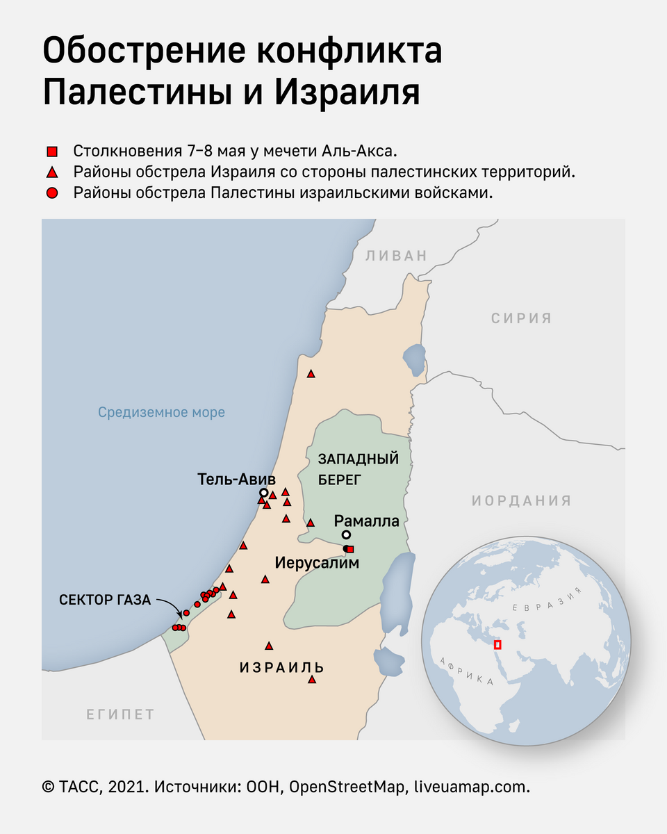 Тем временем агентство ТАСС подготовило инфографику, на которой отображены регионы противостояний между палестинцами и армией Израиля (ЦАХАЛ).