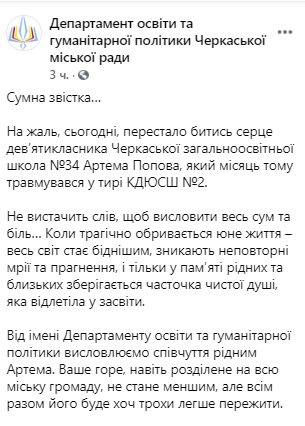 В больнице Черкассах умер девятиклассник Артем Попов, который во время занятия в школьном тире получил тяжелое огнестрельное ранение головы месяц назад.