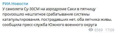 На военном аэродроме в Саках в аннексированном Крыму двоим летчикам истребителя российских ВВС пришлось катапультироваться из-за внештатного срабатывания соответствующей системы самолета.