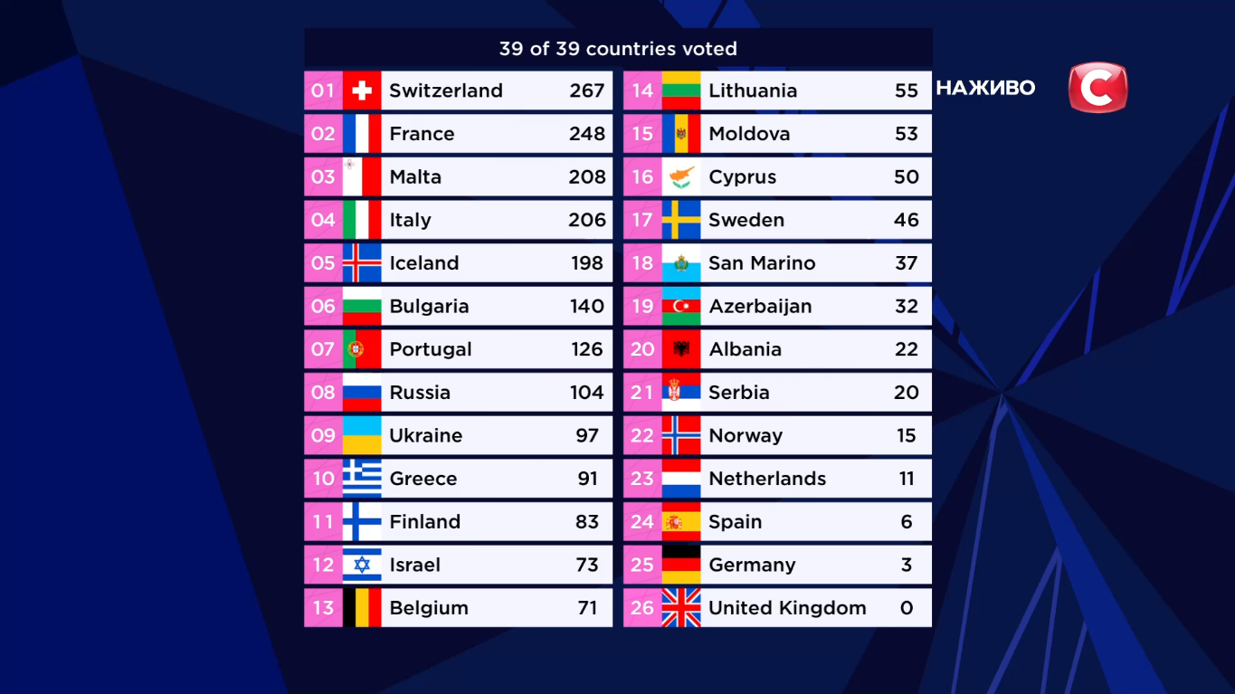 Так, профессиональное жюри присудило украинскому электро-фольк коллективу "Go_A" 97 баллов. До оглашения зрительских симпатий Украина занимала 9-ю строчку в рейтинге.