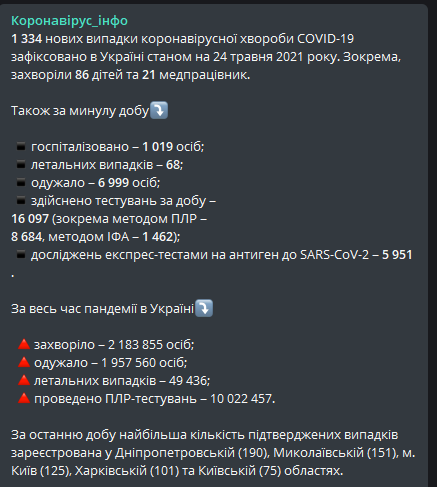 По состоянию на утро понедельника, 24 мая, общее количество зараженных коронавирусом в Украине увеличилось всего на 1 334 человека. Такой прирост является минимальным с начала года.