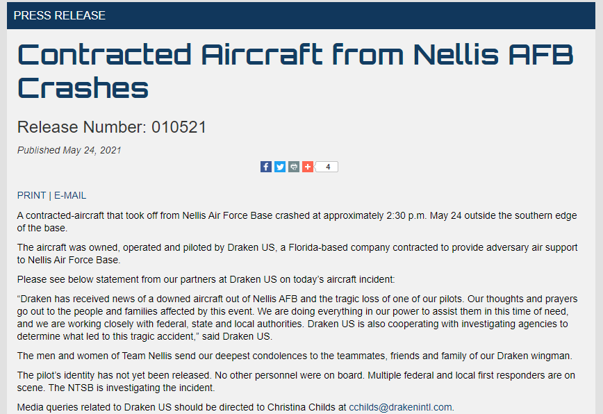 По данным военных, упавший самолет принадлежал, эксплуатировался и пилотировался компанией Draken US, с которой был заключен контракт на обеспечение воздушной поддержки базы в Неллисе.