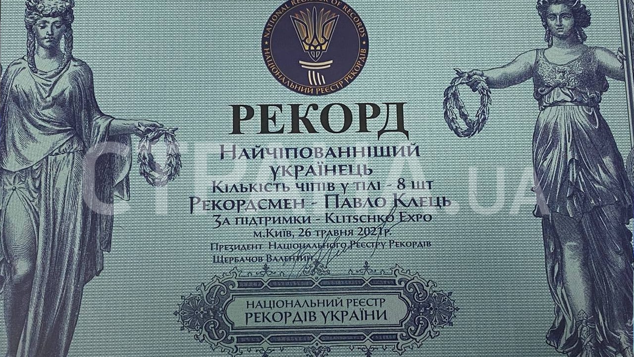 В среду, 26 мая в Klitschko Expo на НCК "Олимпийский" Национальный Реестр Рекордов зарегистрировал самого чипированного украинца. Им стал Павел Клец. До сегодняшнего мероприятия он внедрил в своё тело семь чипов, а во время регистрации рекорда - восьмой.