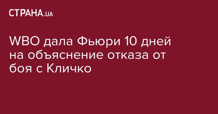 Всемирная боксерская ассоциация дала британскому боксеру Тайсону Фьюри 10 дней на оглашение официальной причины срыва боя с Владимиром Кличко. Об этом сообщает WBO.