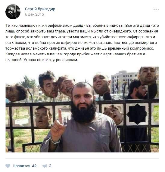 Периодически автор странички ударяется в сторону исламофобии, пытаясь убедить подписчиков, что террористическая организация ИГИЛ тождественен мировой религии - исламу.