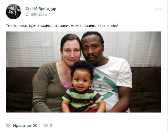 "То, что некоторые называют расизмом, я называю гигиеной", - подписывает автор публикацию с семьей темнокожего мужчины, женщины европеоидной расы и их ребенка.