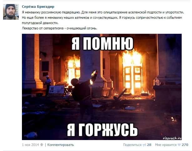 "Я горжусь событиями полугодовой давности. Лекарство от сепаратизма - очищающий огонь", - описывает Серёжа Бригадир свой пост, на котором изображены горящие двери Дома Профсоюзов в Одессе, где 2 мая 2014 года в пожаре погибли люди. Надо отметить, переход Бригадира из экономистов в журналисты достаточно уместный, учитывая, что он ошибся на месяц, ведь указанные в посте "событий полугодичной давности" произошли за 7, а не за 6 месяцев от даты написания поста.