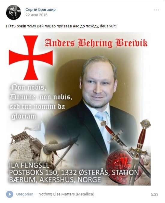 В июле 2016 года Бригадир публикует фото Андерса Брейвика, который в 2011 году совершил серию нападений, в результате которых погибло 77 человек и 151 получили ранения.