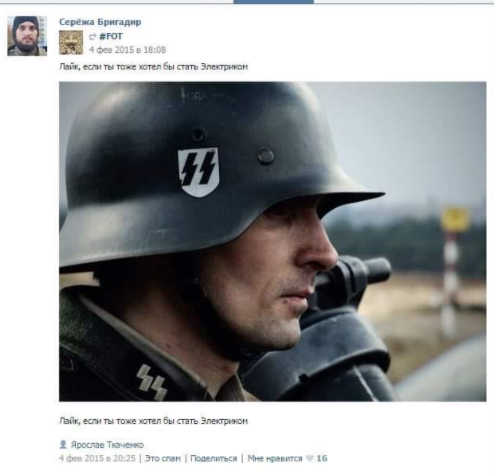 "Лайк, если мечтаешь стать электриком", - делает репост фото с солдатом в немецкой каске Бригадир.