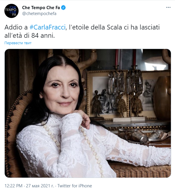 В Италии на 85-м году жизни скончалась знаменитая балерина, прима "Ла Скала" Карла Фраччи. По данным итальянских СМИ, в последнее время она боролась с онкологией, но при этом она продолжала танцевать и преподавать вплоть до последнего дня. Последний мастер-класс она провела в январе 2021 года онлайн, когда театры были закрыты из-за пандемии.
