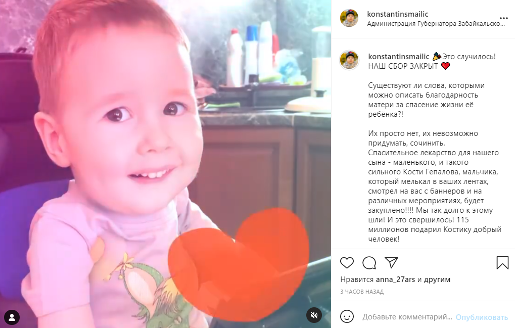 "Спасительное лекарство для нашего сына - маленького, и такого сильного Кости Гепалова, будет закуплено! Мы так долго к этому шли! И это свершилось! Мы благодарим всех, кто не остался в стороне и помогал нам в нашей сложной борьбе!" - написала мама ребенка Светлана Гепалова.