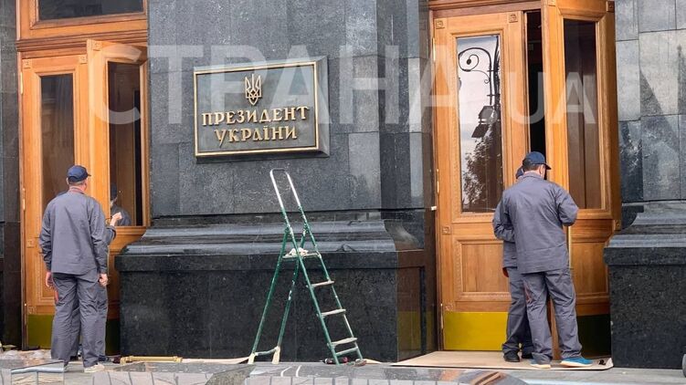 В Офисе президента во вторник, 1 июня, начали устанавливать входные двери, которые были повреждены во время акции протеста сторонников Сергея Стерненко, которые учинили погром на Банковой 20 марта.