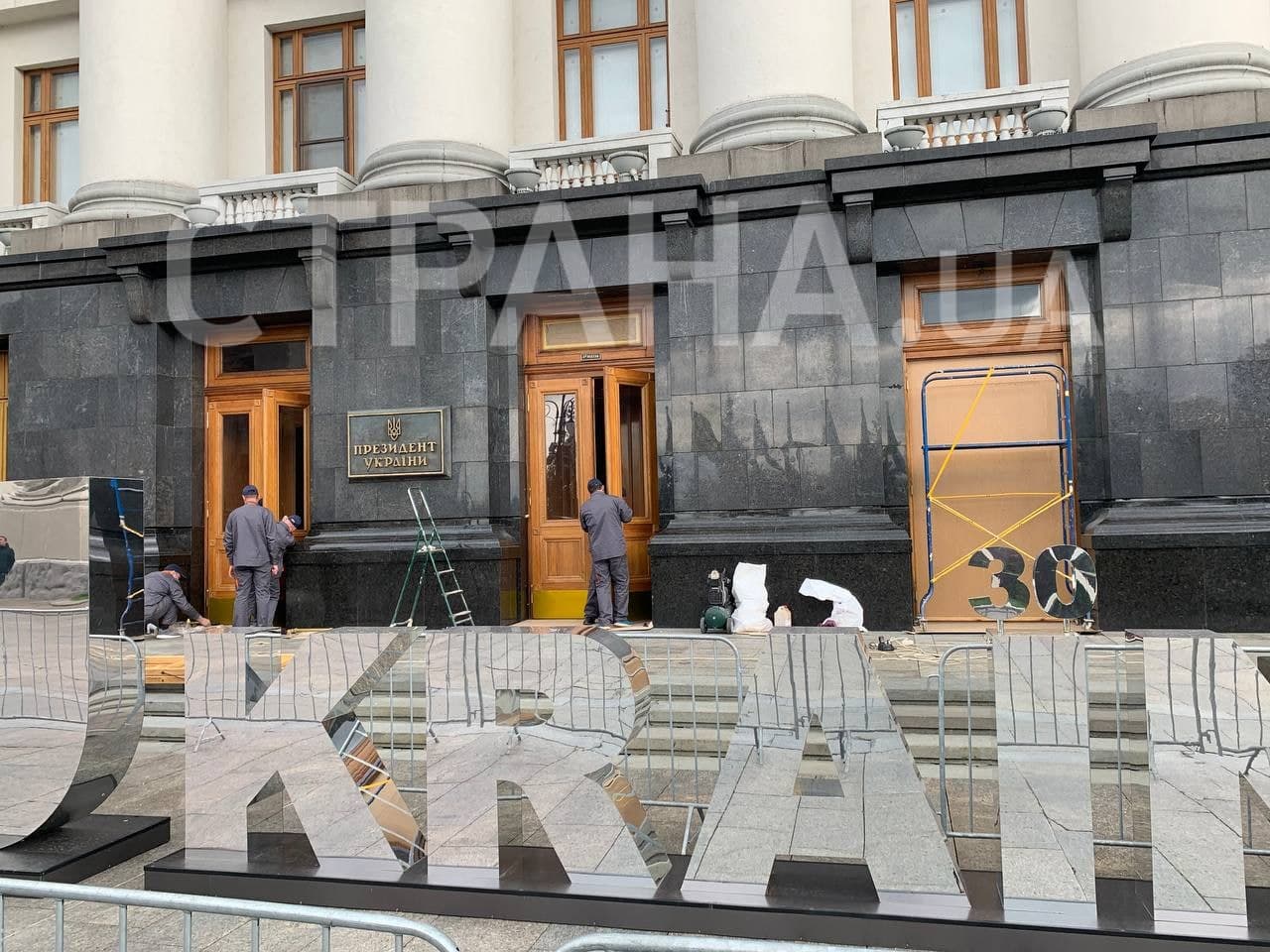 Как передает корреспондент "Страны" с места событий, рабочие устанавливают новые двери на фоне зеркальной инсталляции YOUkraine, установленной к 30-летию Независимости Украины. А сам вход огражден металлическим забором.
