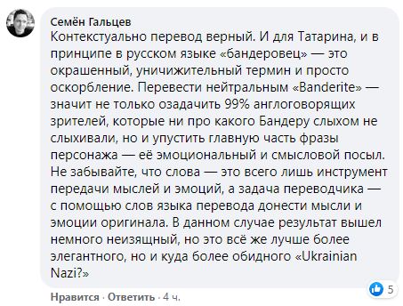 И если раньше у англоязычного зрителя был шанс понять, в чем конфликт, то теперь зрители потеряют смысл пассажа, поскольку большинство из них не слышали ни о каких "бандеритах".