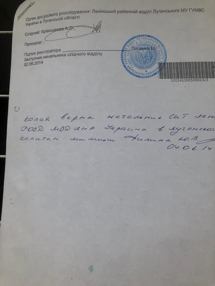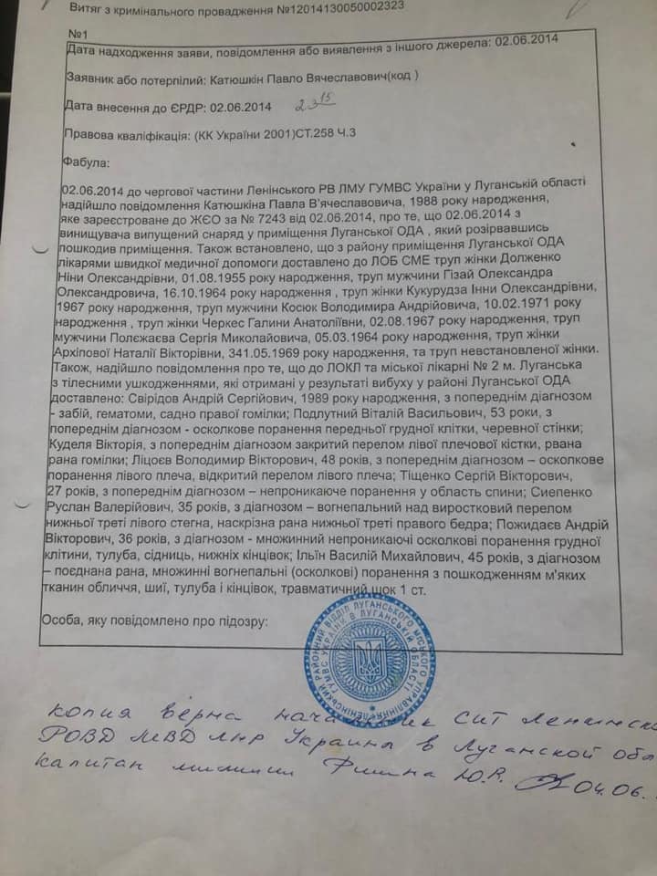 По ее словам, сразу после гибели людей Ленинский райотдел милиции города Луганска открыл дело, где указывается о снарядах, выпущенных из самолета. Есть копия выписки из ЕРДР.