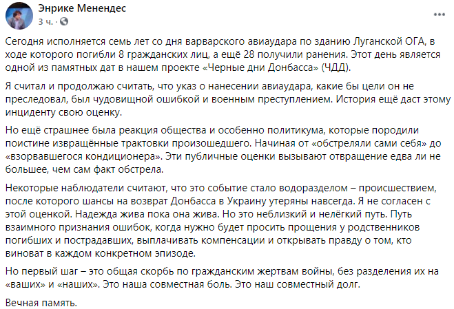 Волонтер Энрике Менендес заявил, что имело место военное преступление. Но даже после этого еще есть шанс вернуть Донбасс Украине - если произойдет взаимное признание ошибок.