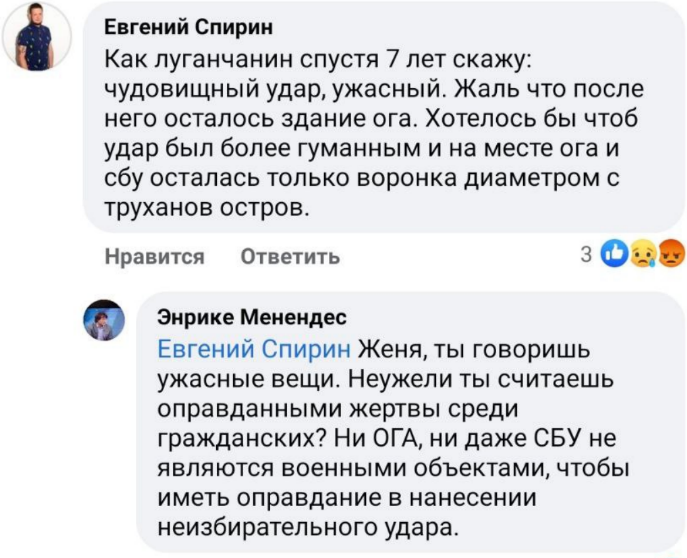 В комментариях Менендесу ответил выходец из Луганска, журналист Евгений Спирин, который сейчас возглавляет издание "Бабель". Он посетовал, что авиаудар не уничтожил все здание ОГА.
