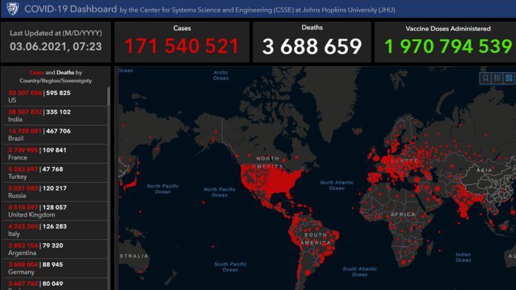 По данным на 3 июня, число зараженных на Земле приближается к 172 миллионам, фото: университет Дж. Хопкинса