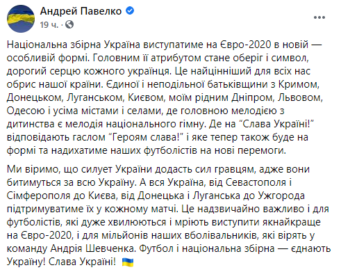 "Единой и неделимой родины с Крымом, Донецком, Луганском, Киевом, моим родным Днепром, Львовом, Одессой и всеми городами и селами, где главной мелодией с детства является мелодия национального гимна. Где "Слава Украине!" соответствуют лозунгу "Героям слава!", который теперь также будет на форме и вдохновлять наших футболистов на новые победы", - написал Павелко.