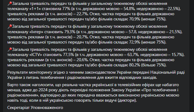 "Результаты мониторинга в соответствии с действующим законодательством Украины переданы Национальному совету Украины по вопросам телевидения и радиовещания для принятия соответствующих мер. Стоит также отметить, что реальная доля украинского в телевизионных эфирах еще намного меньше, ведь до 2024 года действуют переходные положения Закона Украины "О телевидении и радиовещании", согласно которым передача считается выполненной на украинском языке даже тогда, когда в ней на украинском говорят только ведущие (дикторы)", - отмечает Креминь.