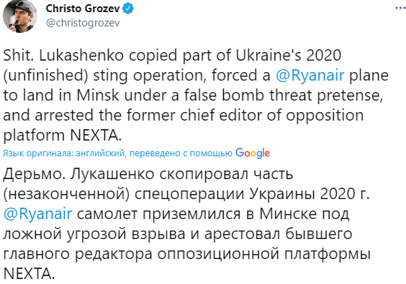 "Дерьмо. Лукашенко скопировал часть (незаконченной) спецоперации Украины 2020 года, заставив сесть самолет Ryanair в Минске под угрозой ложного взрыва, и арестовал бывшего главного редактора оппозиционной платформы NEXTA", - сравнил он две ситуации в Твиттере.