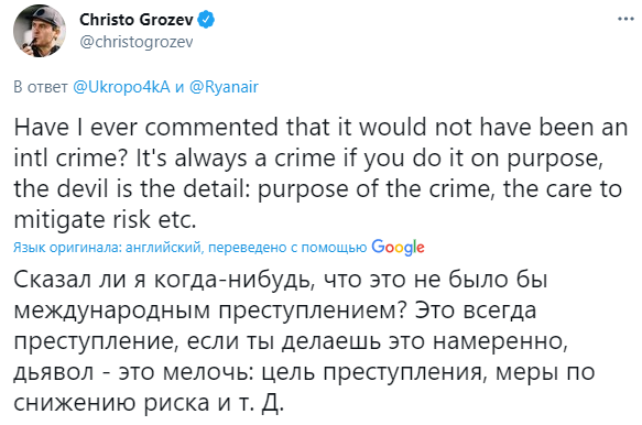 В ответ на это Христо Грозев признал, что и Украина намеревалась совершить преступление против международного права. Но дал понять, что некоторые такие преступления могут быть оправданы высокой целью.
