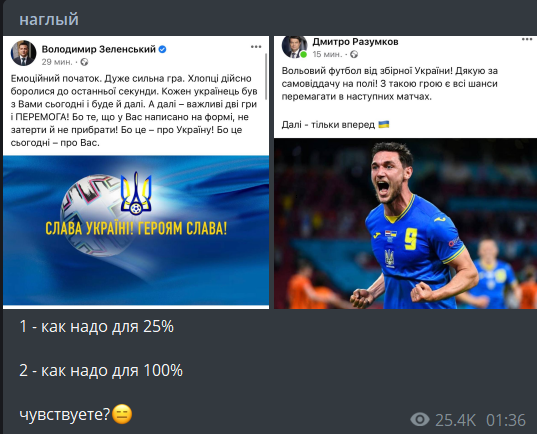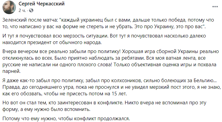 Вчера вечером все реально забыли про политику! Хорошая игра сборной Украины реально откликнулась во всех. Было приятно наблюдать за ребятами. Вся моя ватная лента, все русские не написали ни одного плохого слова! Только объективная оценка игры и похвала парней.