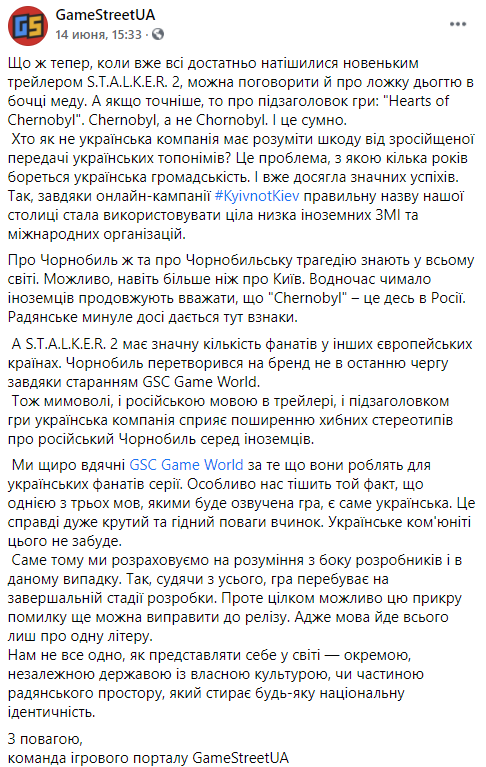 Послышались претензии от патриотов, которые специализируются на видеоиграх. Сообщество GameStreetUA, которое выступает за украиноязычную локализацию игр, написало критический пост о "Сталкере-2" и его отношению к украинскому языку.
